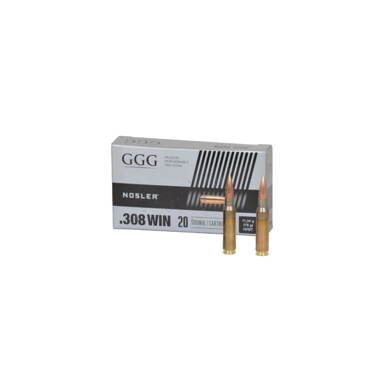 Amunicja 308 Win GGG HPBT 11,3g/175grs Nosler Dane: kaliber: 308 Win typ pocisku: Nosler HPBT masa: 11,3g/175grs producent: GGG Cena dotyczy 1 szt.